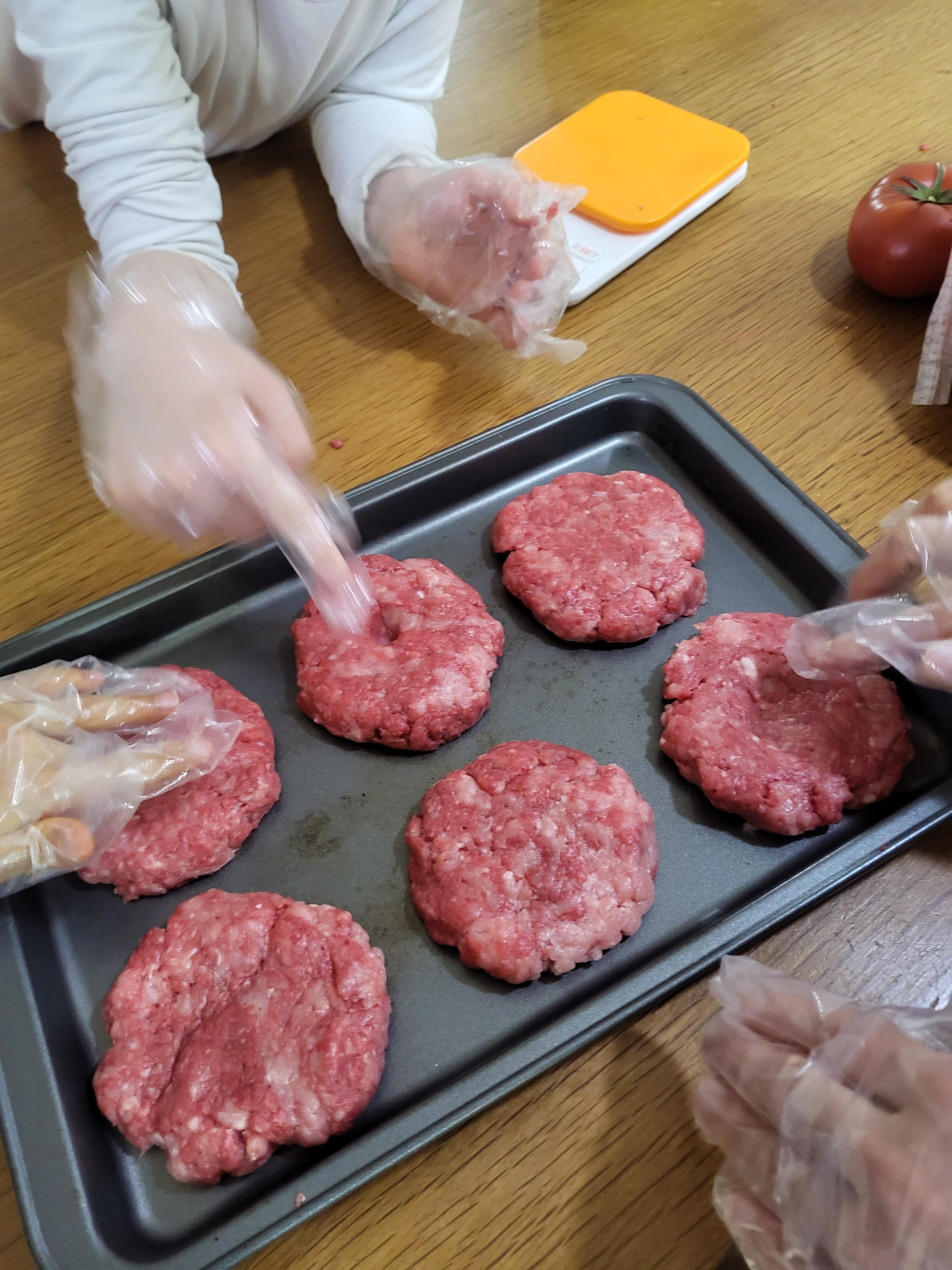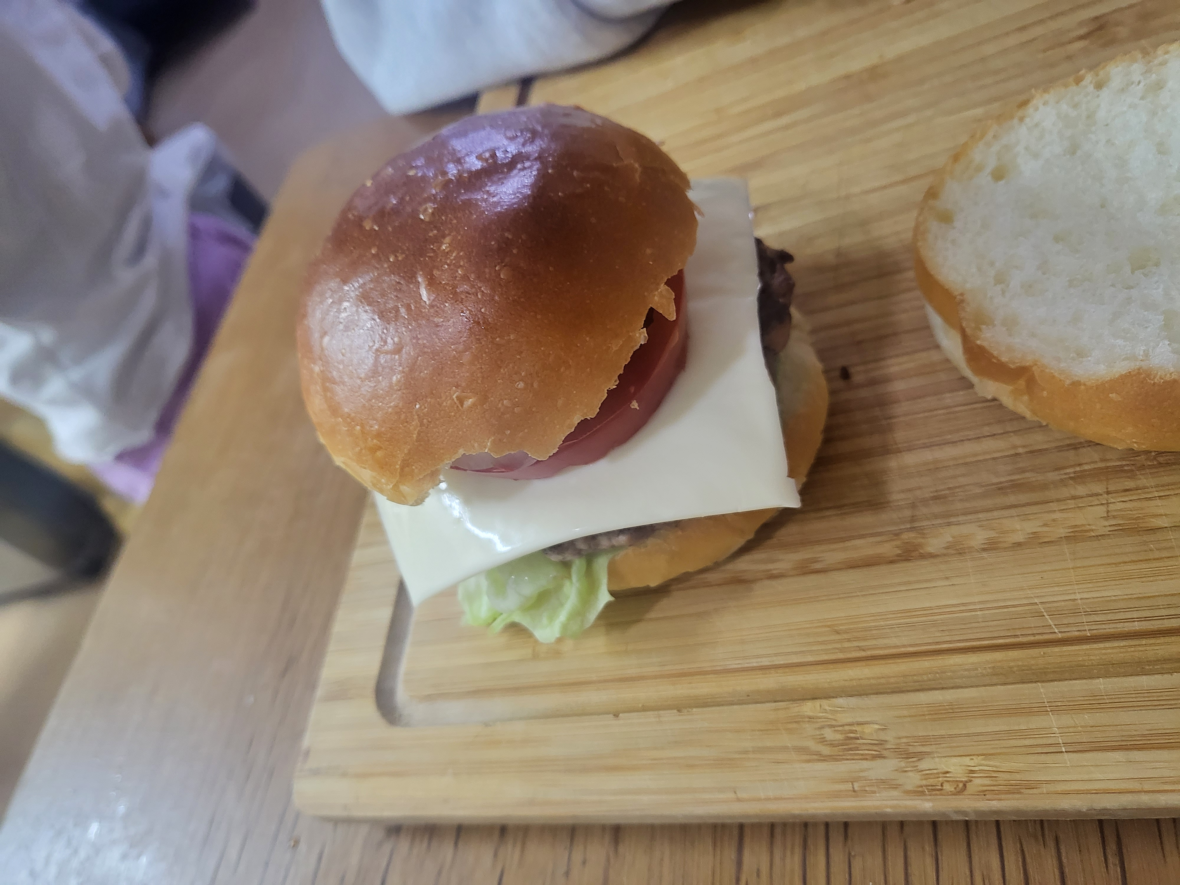 재료 : 햄버거빵 5개 (직접 만들수도있지만 시간 오래 걸림), 소고기 300g, 돼지고기 300g, 양파 1개, 양상추 5장, 토마토 2개, 치즈 5장, 케첩과 마이요네즈