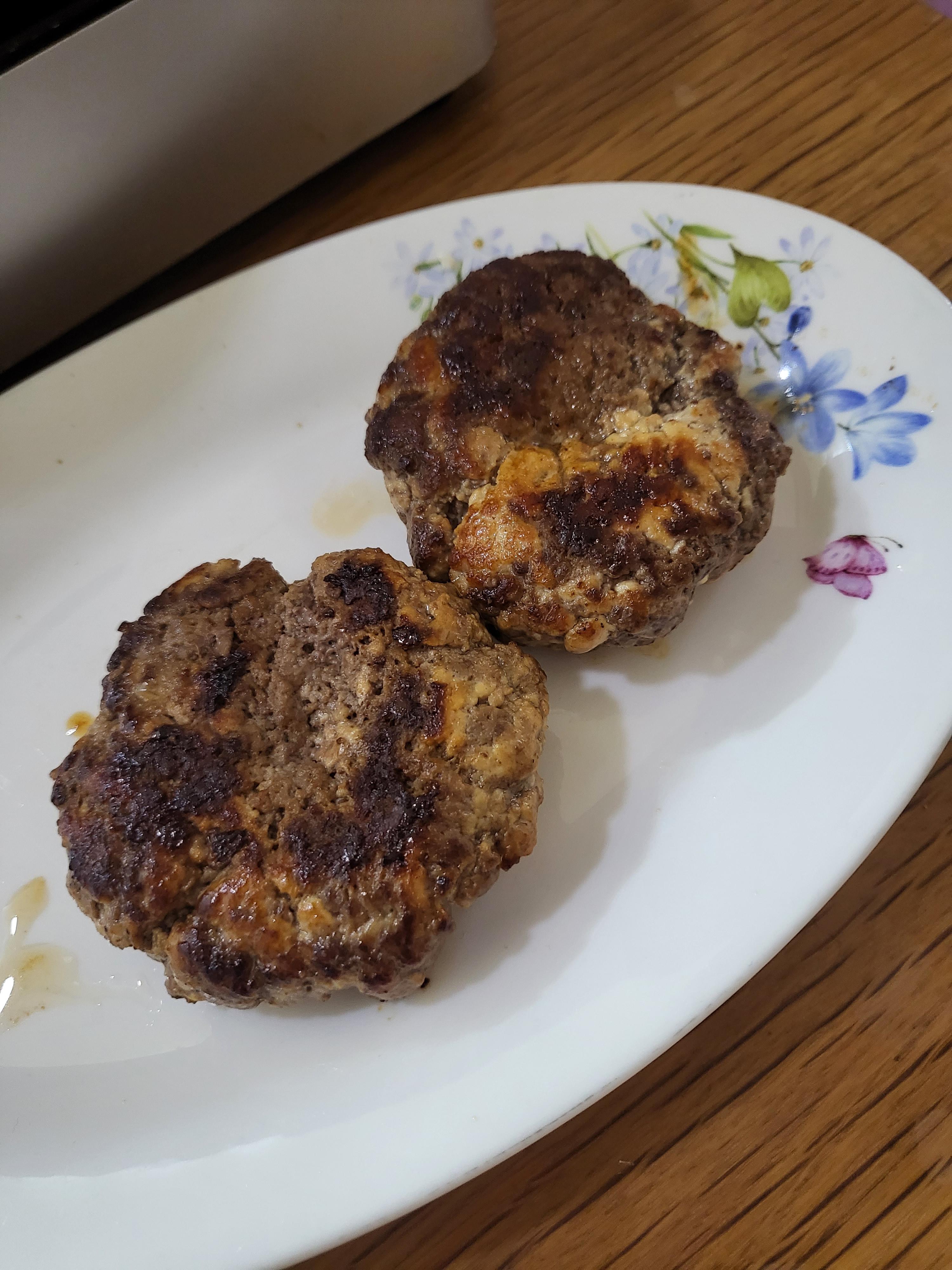 6. 패티를 굽기 위해 후라이팬을 달군 뒤 만들어 놓았던 패티를 올려 구워준다. 이때 물을 살짝 넣어서 구워주면 수분기를 흠뻑 먹은 촉촉한 패티가 완성된다~ (뚜껑이 있다면 덮어 주면 더 좋다)