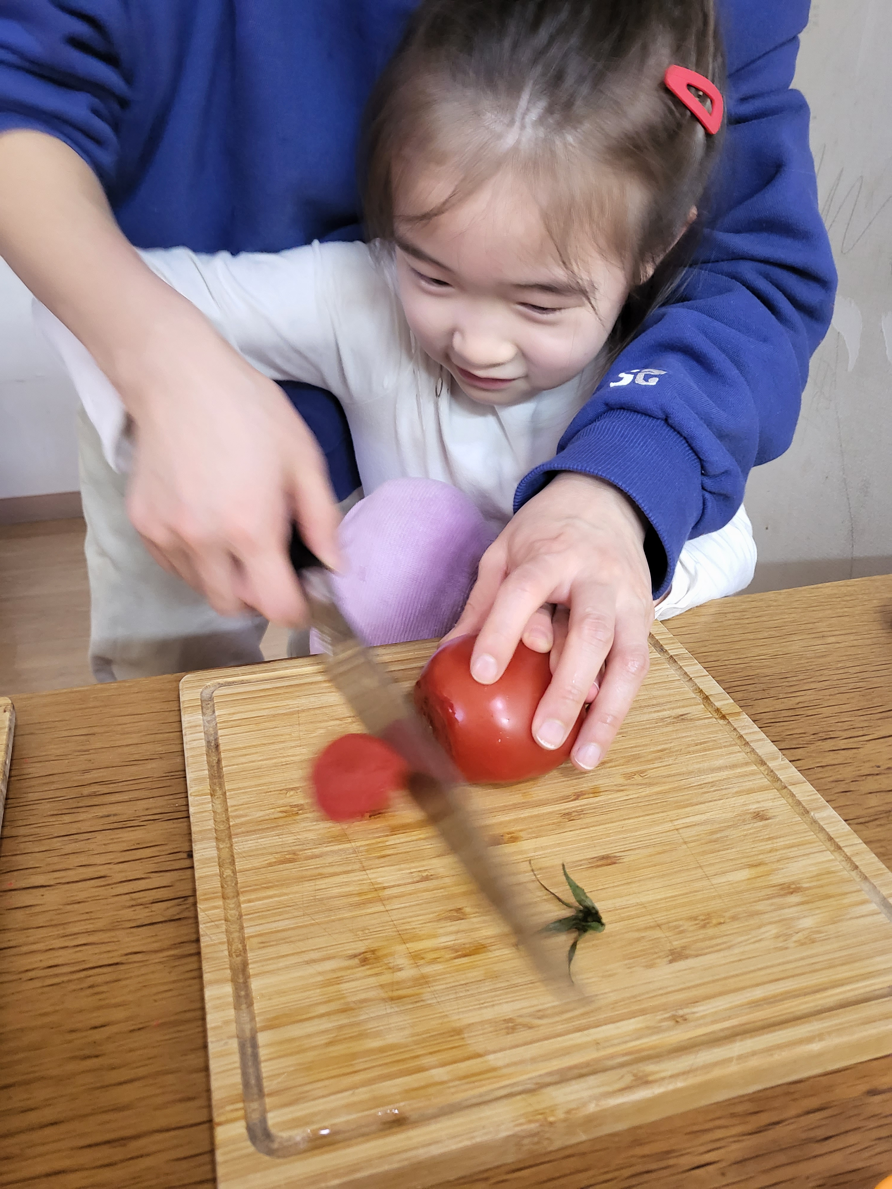 4. 토마토랑 양파도 햄버거에 들어갈 수 있게 얇게 썰어준다. 아이가 스스로 할 수 있을 줄 알았는데 아직은 살짝 어려워해서 썰어 주었다~